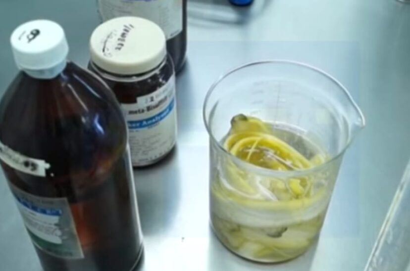 Uno de sus avances más importantes es el metabisulfito sódico, para evitar que las cáscaras de plátano se oscurezcan y puedan agarrar mejor el colorante. Como si se tratara de una receta de cocina, explican que primero extraen el almidón con la glicerina, para más tarde mezclarlo todo en una licuadora y, 24 horas después de secarlo al sol o en un horno, obtienen el bioplástico. Además, a la última muestra le han agregado fibras de troncos del jardín de Meza para hacer el material más resistente.