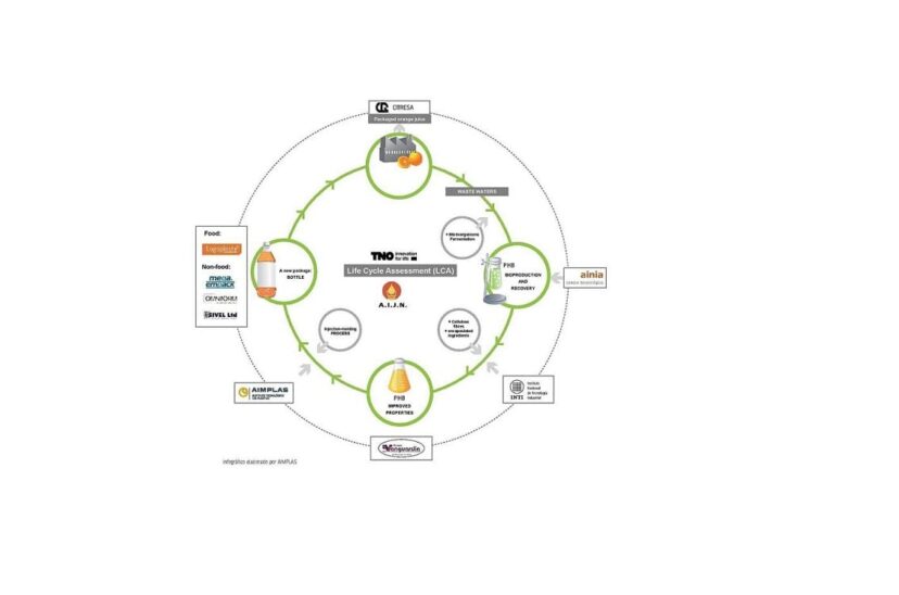 En una tercera fase, este material reforzado y mejorado en sus propiedades, se moldeará y será utilizado para fabricar botellas de zumo. Finalmente, estas botellas serán validadas y testadas, envasándose en ellas el zumo de frutas de la misma industria generadora de las aguas residuales. Así se cierra el ciclo: El generador del residuo se convierte en el beneficiario del nuevo envase, adaptado a la necesidad de su producto.