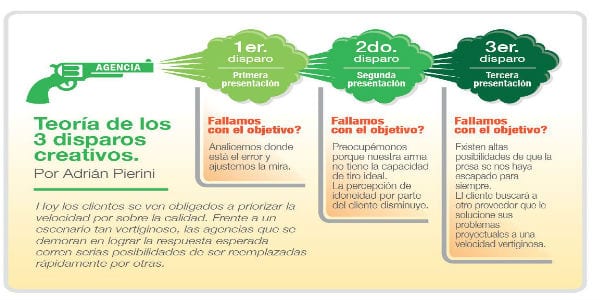 Paso a explicarlo: desde el momento en que me pasan un brief de ejecución veloz como el ya descripto, suena la señal de alarma y determino que a partir de ese momento contaré con solo 3 balas (3 presentaciones), para dar en el blanco, es decir, para lograr el objetivo buscado por mi cliente.