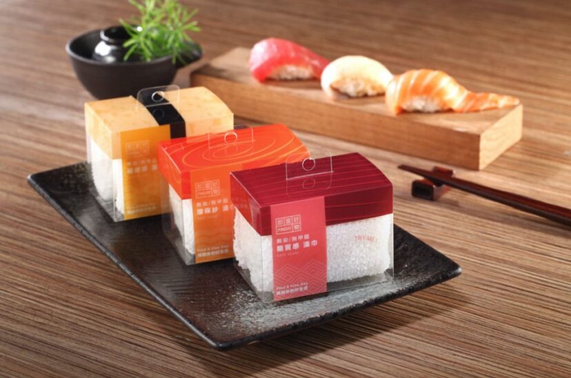 Se trata de un packaging sencillo de plástico transparente y con forma rectangular que empaqueta de manera individual una toalla cuidadosamente enrollada. En la parte superior de la caja, se ha colocado estratégicamente la ilustración que imita el aspecto del pescado crudo típico del sushi. Un agujero circular en la caja permite al consumidor tocar el textura de la toalla antes de comprarla y sin abrir el envase.